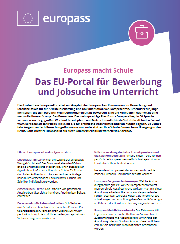 Das kostenfreie Europass-Portal ist ein Angebot der Europäischen Kommission für Bewerbung und Jobsuche sowie für die Selbsteinschätzung und Dokumentation von Kompetenzen. Lehrkräfte finden im Europass-Portal zahlreiche Tools, die sie für praktische Unterrichtseinheiten nutzen können.