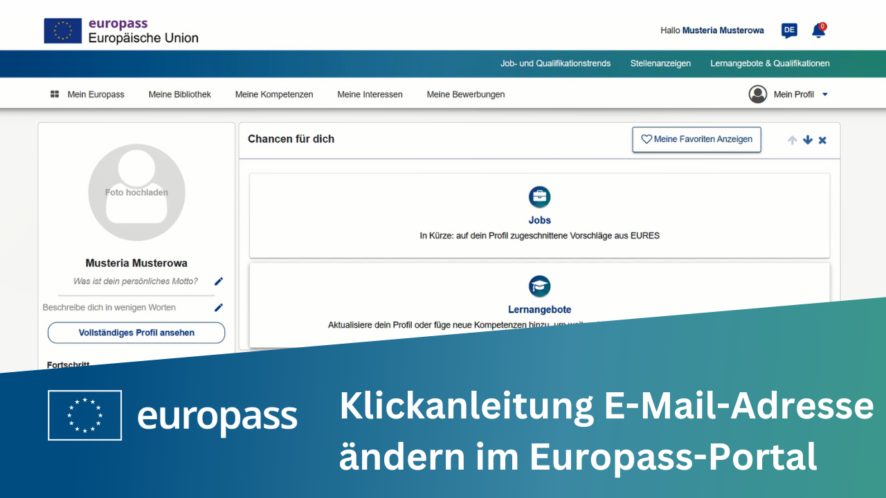 Die Klickanleitung erklärt, wie eine bereits bestehende E-Mail-Adresse im Europass-Portal geändert werden kann. Die Änderung muss im EU-Login-Konto gemacht werden, das mit dem Europass-Portal verknüpft ist.